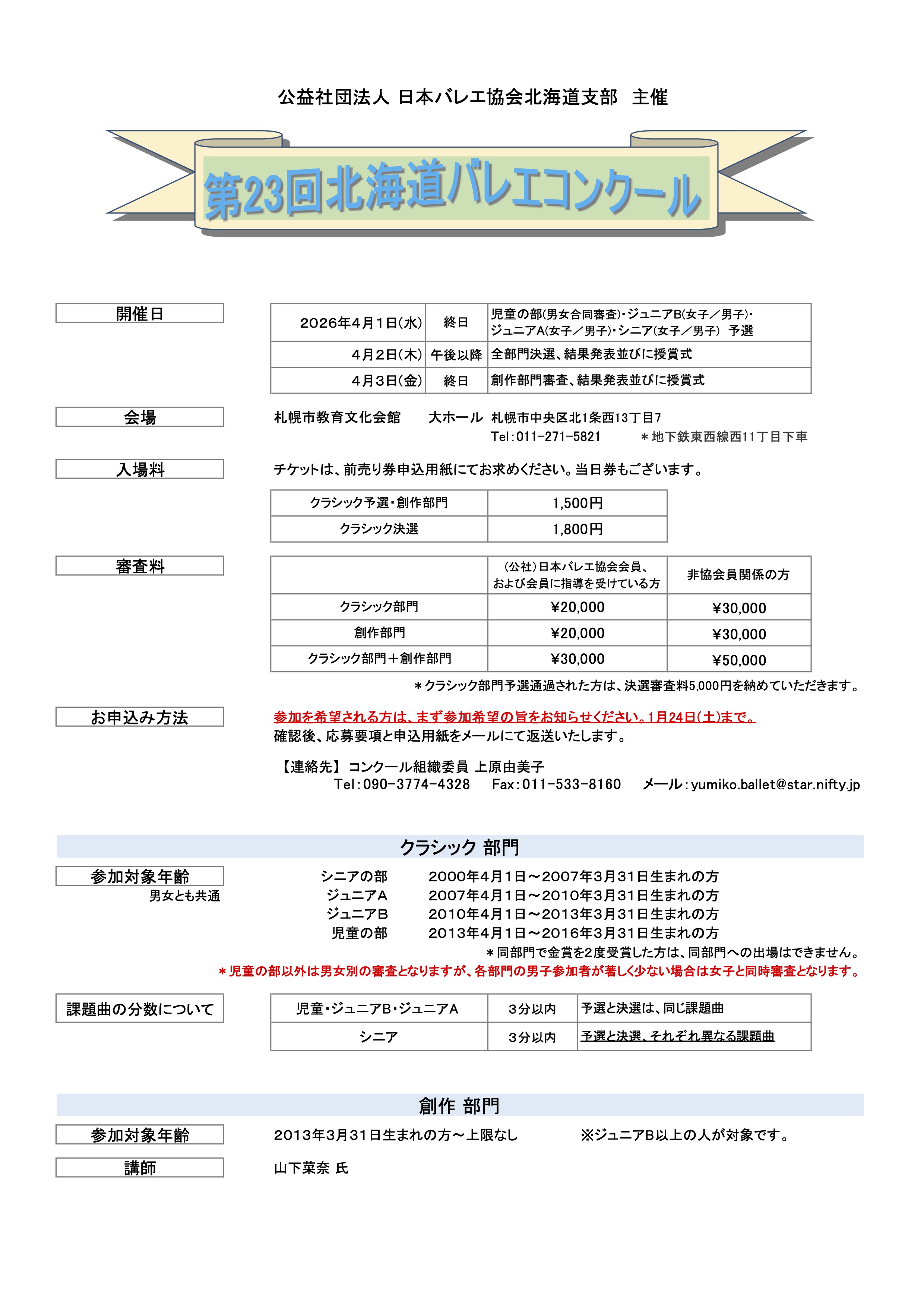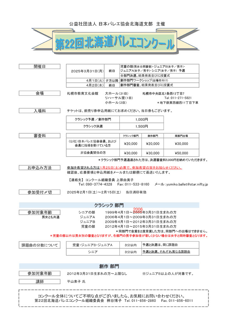 会場/千歳北ガス文化ホール 千歳市北栄2丁目2番11号 ●申込先/〒062-0035 札幌市豊平区西岡5-1-4-15 桝谷方 (公社)日本バレエ協会北海道支部 コンクール事務局 ●問い合わせ先/TEL.011-856-2860(桝谷)FAX.011-856-6011 主催/(公社)日本バレエ協会北海道支部 後援/北海道・北海道教育委員会・札幌市・札幌市教育委員会 北海道新聞社 協賛/チャコット株式会社・株式会社シルビア・ミルバ アートスタッフ・ 東京ドームホテル札幌・アトリエヨシノ ビデオ・アイ |